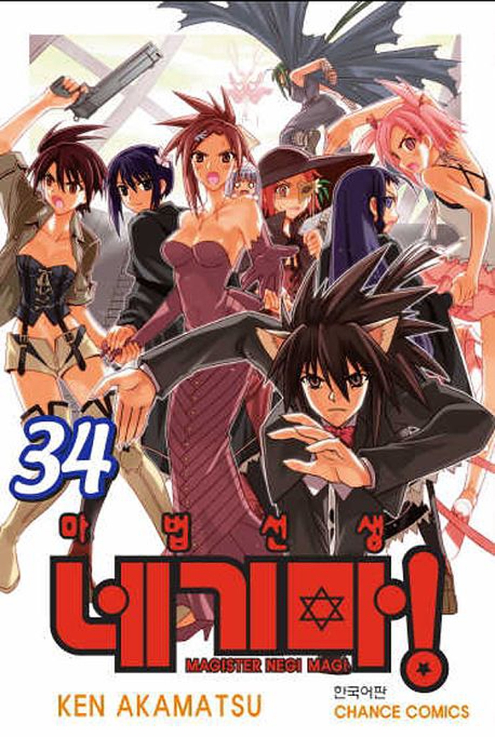 Ken Akamatsu 만화 『마법선생 네기마』 제34권. 본 작품은 10살짜리 꼬마 마법사 네기 스프링필드가 마호라 학원의 영어 선생님으로 부임해 오면서 31명의 미소녀들의 담임이 되면서 펼쳐지는 이야기를 그려낸 만화이다. 순진무구한 네기 스프링필드의 표정과 행동이 특징적이다.