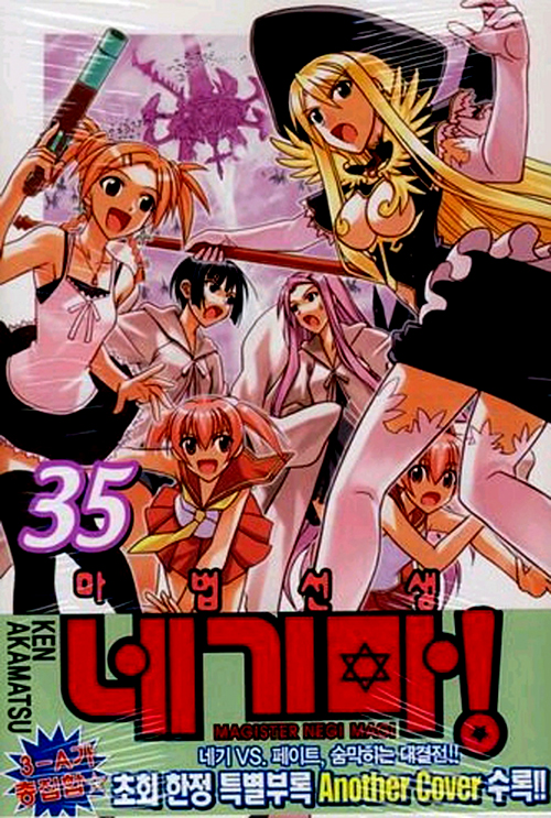 Ken Akamatsu 만화 『마법선생 네기마』 제35권. 본 작품은 10살짜리 꼬마 마법사 네기 스프링필드가 마호라 학원의 영어 선생님으로 부임해 오면서 31명의 미소녀들의 담임이 되면서 펼쳐지는 이야기를 그려낸 만화이다. 순진무구한 네기 스프링필드의 표정과 행동이 특징적이다.