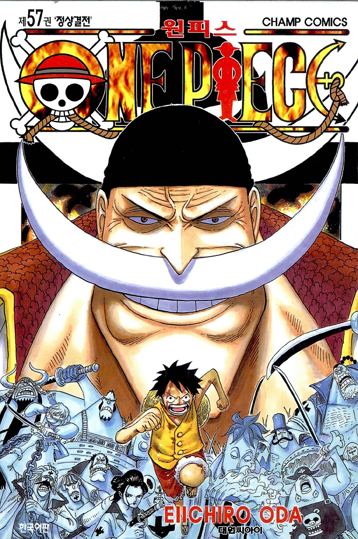 Eiichiro Oda 만화『원피스』제57권. 세계최강의 해적, 움직이다!! 에이스를 되찾기 위해 '해군', '왕의 부하 칠무해'와 전면전쟁에 돌입한 '흰 수염' 대함대!! 세계를 뒤흔드는 정상결전에 루피는 과연 참전할 수 있을 것인가?! 최고의 보물 '원피스'를 둘러싼 해양 액션 로망!!